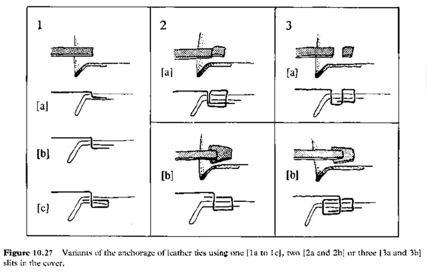 As for the fore-edge treatment: in the photographs of the original, it looks like there were, at one time, buttons attached to the spine plate. I can only assume that there is/was a fore edge flap with ties that once attached to the buttons to hold the volume closed, however I could not find a decent photo of what is actually going on there. Szirmai includes diagrams of a few variations on leather ties for limp structures, and I decided to go with a three-hole structure (listed as 3a in the diagram below) that offers a simple outward appearance.