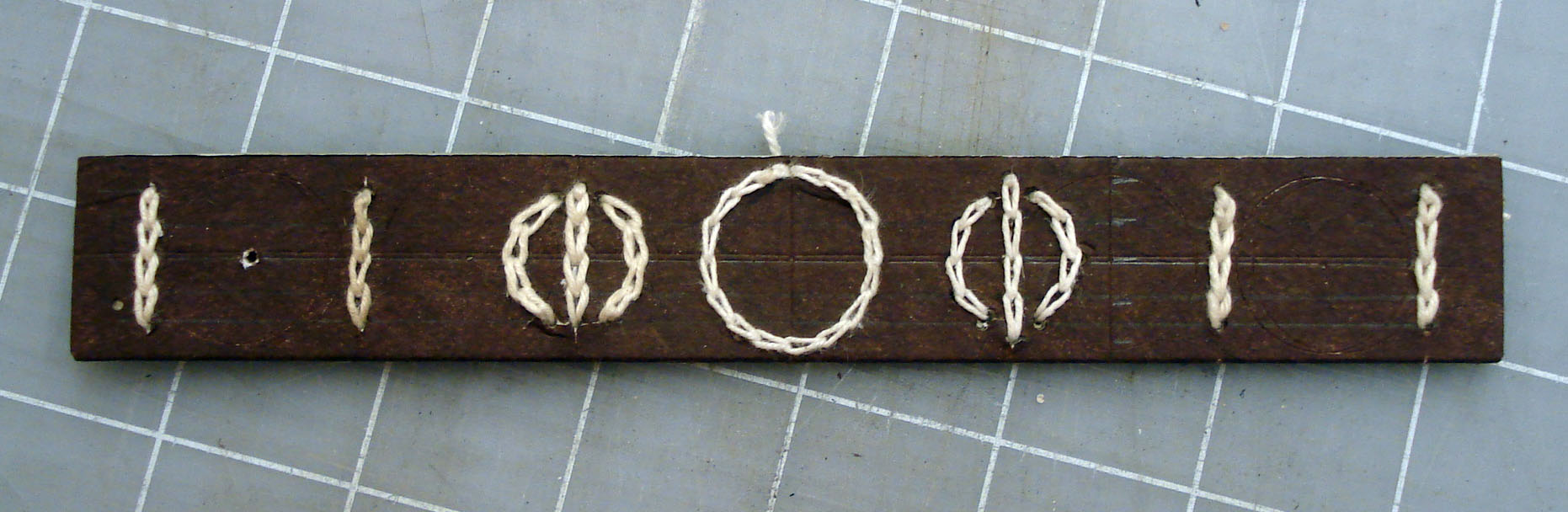 As you can see, I’ve shifted the alignment of the 2nd and 5th sewing stations in order to make a more even spacing in the pattern for my model – with the kind of long and skinny dimensions of this book, it just looked better to me.   Next I went ahead and made a model of the spine plate with binder board covered in paper to check that the pattern looked alright with the rather thick size of thread (18/5) that I intended to use.