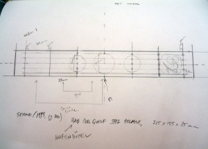 The fact that the circular sewing is not part of the structure makes the whole operation quite a bit easier; however there is still some planning that must go into mapping out the stations. While the original is done with a horn spine plate, I made a variation on this structure with a maple spine plate and goatskin parchment covers. As the width of my piece of maple was somewhat narrower than the horn used in the original, I decided to use the dimensions of my original spine piece as the basis for my final model size, rather than attempt to make an exact duplicate. There are quite a few holes to drill for this sewing pattern, and to ensure that I got it right, I first worked the pattern out to scale on paper.