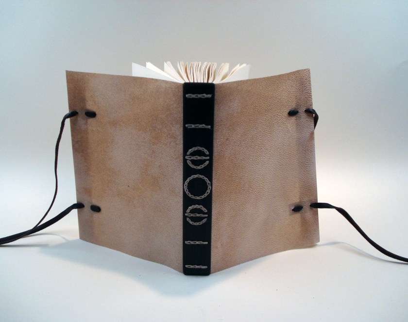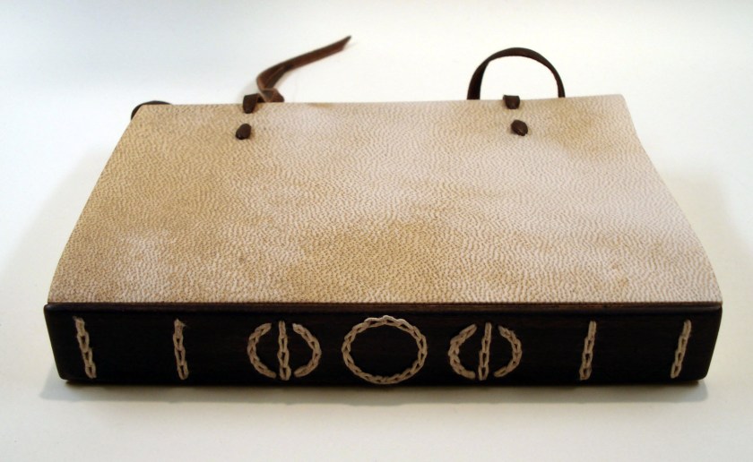 Taking the time to make this ‘dummy spine’ actually worked to my advantage, because once I had checked the layout, I just used it as a jig to punch the parchment cover and mark the wooden spine plate for drilling. When the spine plate and cover were ready, I stitched them together along the circular parts of the pattern. Paper sections were then folded, trimmed to the height of the spine piece, pierced with 6 stations, and attached to the cover via the straight chain sewing of the pattern using Larsson’s method. The final product looks like this: