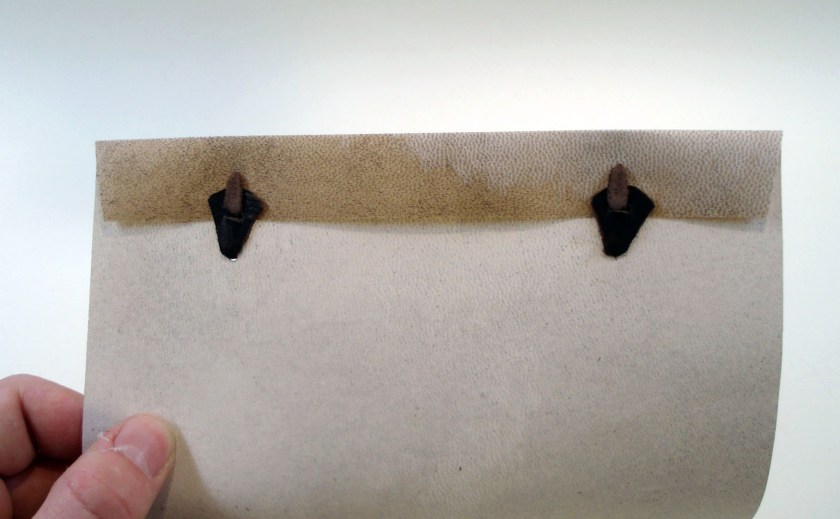 The diagrams appear to illustrate the leather tie lacing through slots in the covers, but I found that after mechanically softening the leather, the lacing looks a bit neater when done through rounded holes. This also keeps the parchment from splitting or tearing at the edges of the slot.