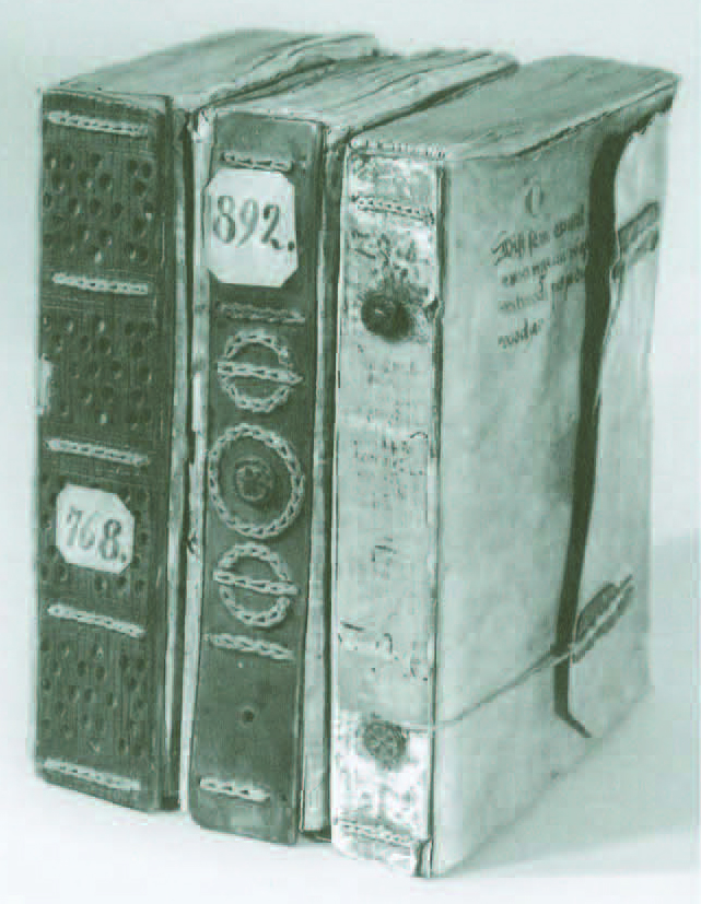 As Boston is currently being pummeled by snow, I figured it best to stay inside and catch up a bit on my bloggin’. Ever since we first tried out some variations on limp medieval structures back in October, I’ve been meaning to revisit them using materials that are a little more refined than paper covers and laminated skin spine plates. I went back through the chapter on limp structures in Szirmai’s (2000) Archaeology of Medieval Bookbinding as well as Pam Spitzmueller’s article on long and link stitch structures (GBW Journal, 2000)  for some inspiration from historical examples. It seems in any of the literature on this type of structure, one inevitably finds images of two particularly fine examples from the Herzog August Bibliothek in Wolfenbüttel (pictured left and center below).