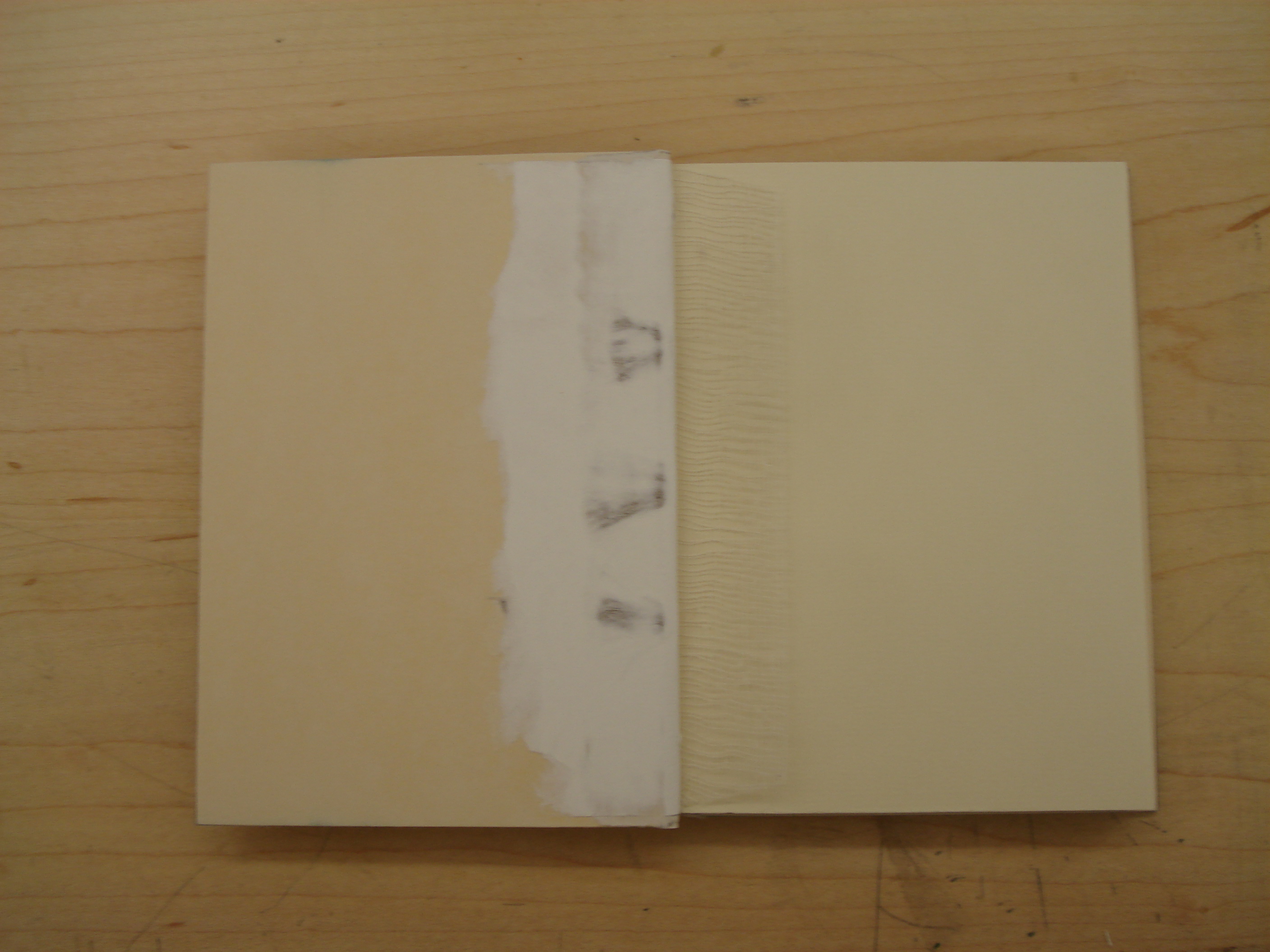 The endsheet construction will depend upon the method of assembly. For the on-set boards version, the endsheet is composed of a single folio of decorative paper with a 2cm strip of mull tipped to the outer edge. A folio of  plain paper is then wrapped around, forming a plain flyleaf and wastesheet. This whole assembly is then folded 5mm away from the edge to make a hook, which is wrapped around the first or last section of the text (Riley, 2006, p. 10).