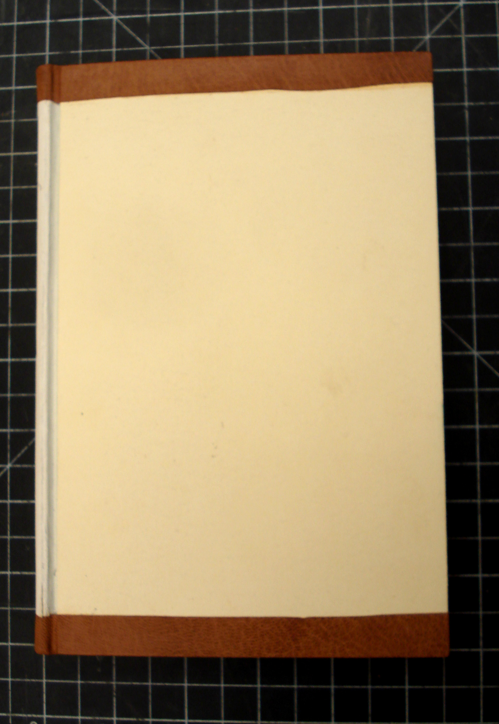 The leather covering is done first, and, for this style of binding to look right, the edges of the leather cannot be visible under the paper covering. Once the leather is covered over, any sudden changes in transition from leather to board surface will be very apparent and look sloppy.