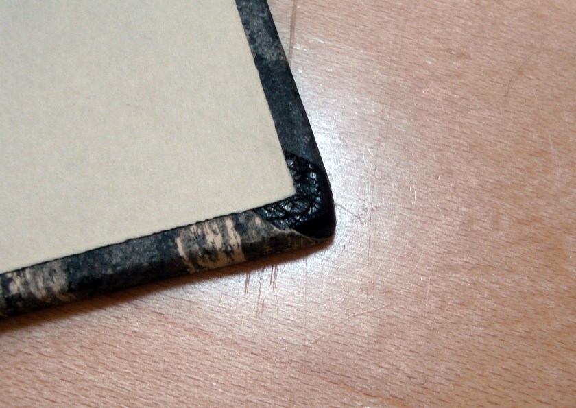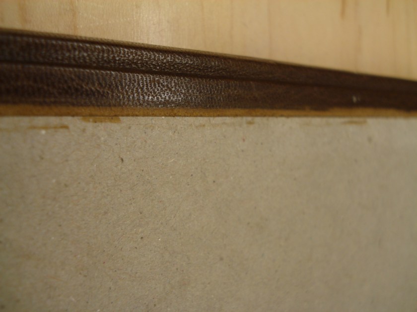 There are two methods for dealing with the thickness of the leather. The first is to flat pare the leather, cover, then in-fill the remaining space on the boards before covering with decorative paper (Verheyen, p. 28). The second method is to edge pare the leather, cover, then further pare and sand the leather to achieve a long, gradual bevel onto the board surface (Riley, p. 15).