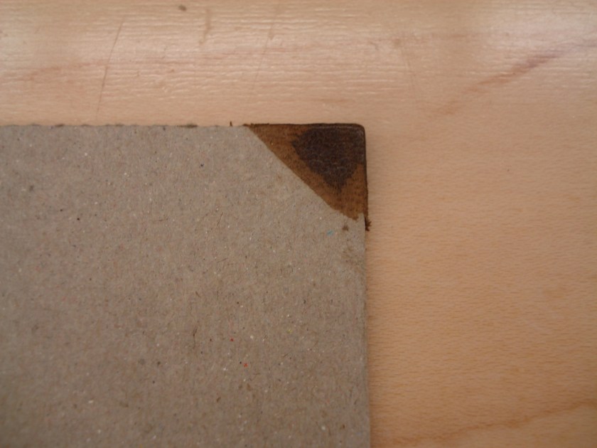 If following Riley’s method of beveling the leather, the  millimeter of skin that will be exposed is marked out with dividers and the edges further pared at a shallow angle with the knife. The edge is also sanded to get a very smooth surface. The leather patches at the corners are done at this point and sanded smooth in the same way.