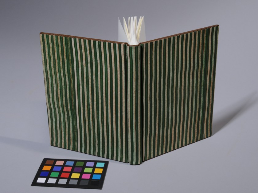 To finish, the boards are covered in decorative paper and the endsheets pasted down. Paste papers are quite common in the examples that I’ve seen.