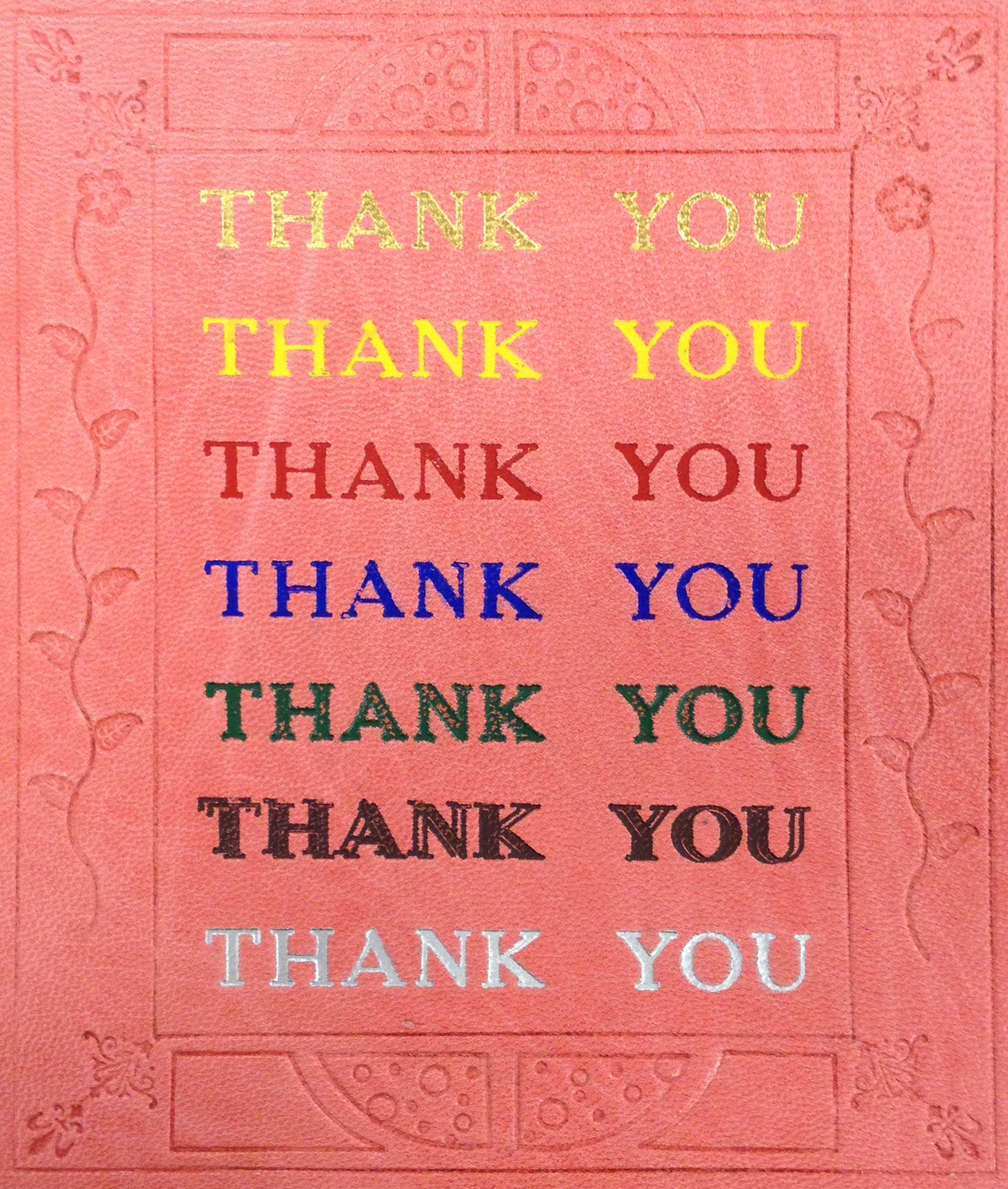 A pink leather plaquette with lots of foil stamping and blind tooling for Sarah Reidell.