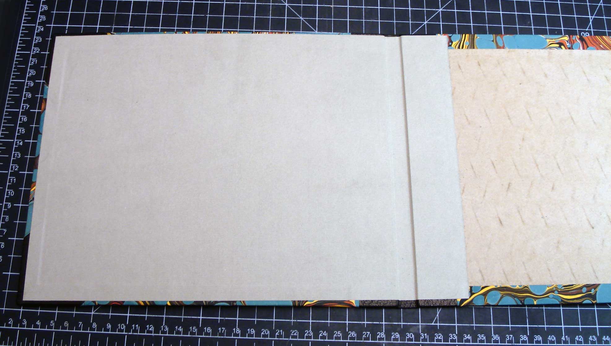 After trimming out the inside, the pastedown can be done with either paper or cloth and is cut wide enough to cover the inside of the joint. Depending upon the lining of the outside of the boards, the inside can also be in-filled to counteract excessive pull.