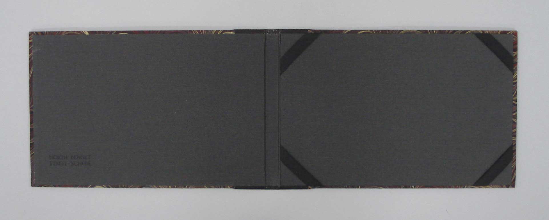 The second component of the portfolio is the back pad that holds the document. This is constructed of thin board (such as museum board) and is covered with the same material as the pastedown. Short sections of ribbon are glued to the back corners, and the whole thing is adhered to the inside of the back board.