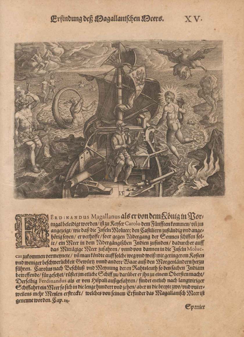 This one depicts Ferdinand Magellan on his ship, plotting a course while the various personified elements and beasts of the sea writhe about him. In the upper right hand corner, though, there is this fantastic image of a bird carrying an elephant.