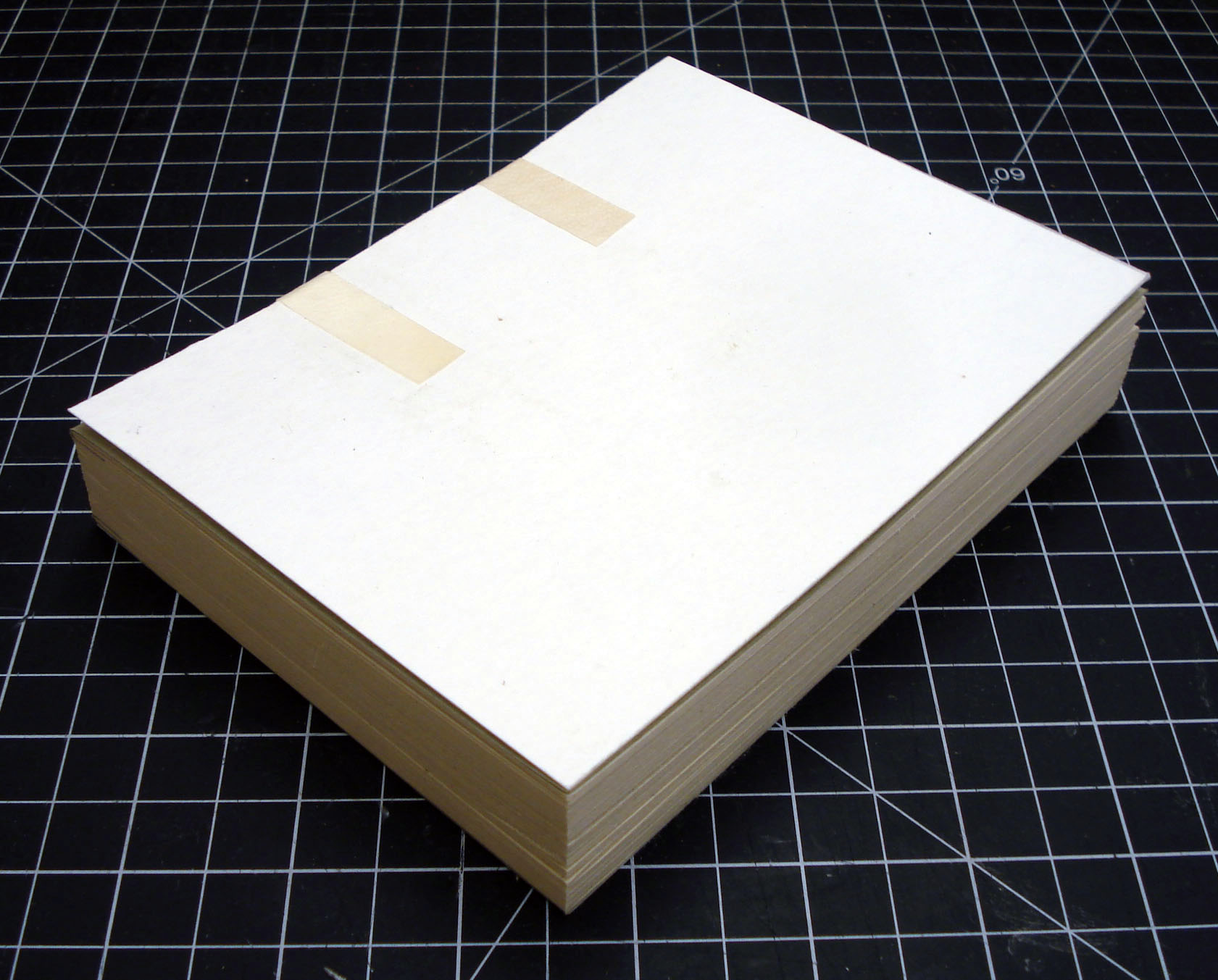 The next step in making this structure is to prepare the cover. Lindsay’s (1991) article does an excellent job of describing the formation of a modern cover that uses cuts and tabs for the mechanical attachment of the turn-ins at the corners. Clarkson (2005) includes diagrams of two other versions with interlocking tabs. Historically, I think the turn-ins were sometimes just pasted down. As the cuts are somewhat complex and vellum is an expensive material to waste, Lindsay recommends making a paper template first (above). I used 10 pt folder stock for mine. All the measurements are taken directly from the textblock, resulting in a cover that is an exact fit. The vellum is cut out according to the paper template; Lindsay recommends cutting windows out of the paper template, so that the best part of the skin may be chosen.